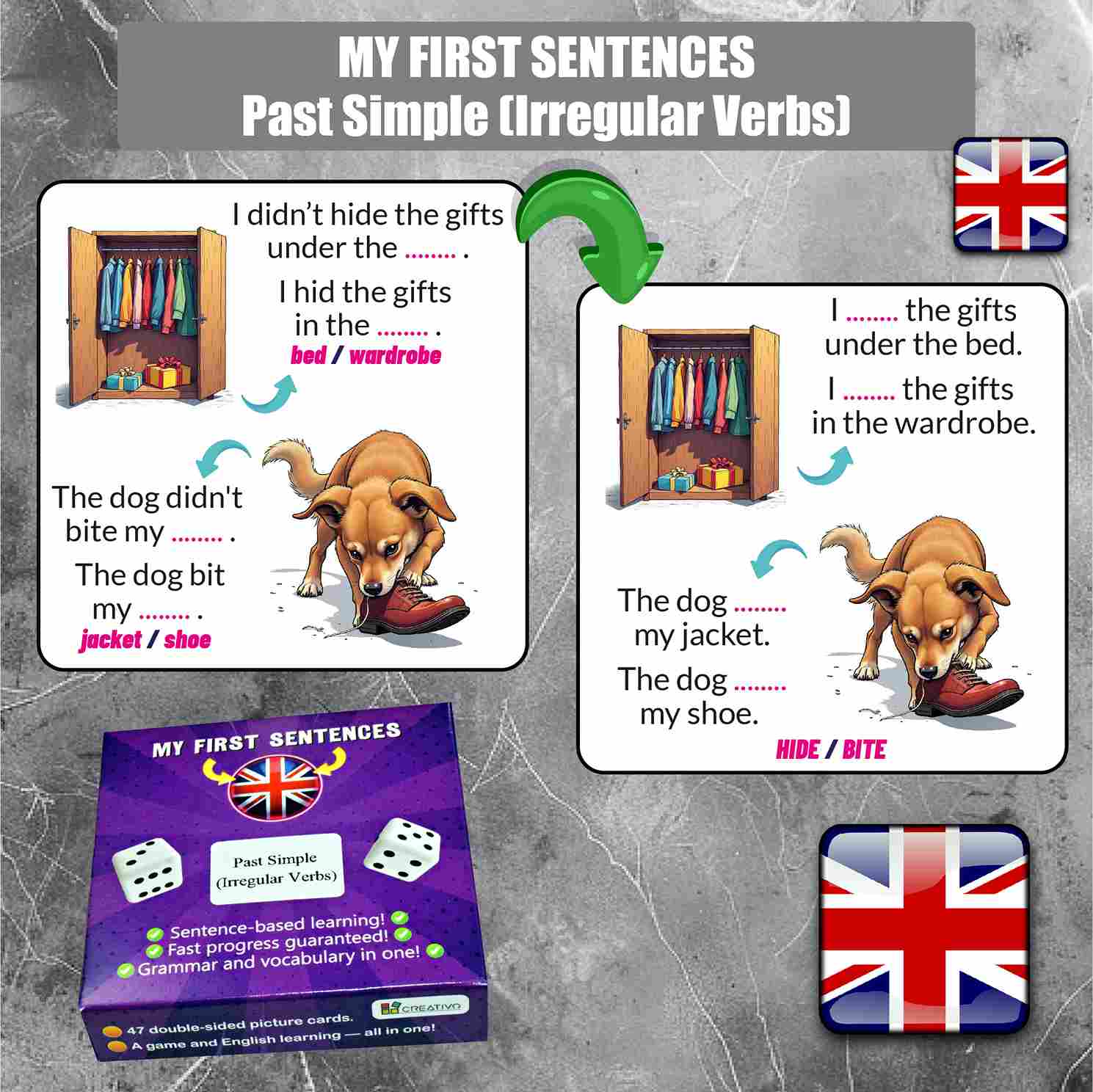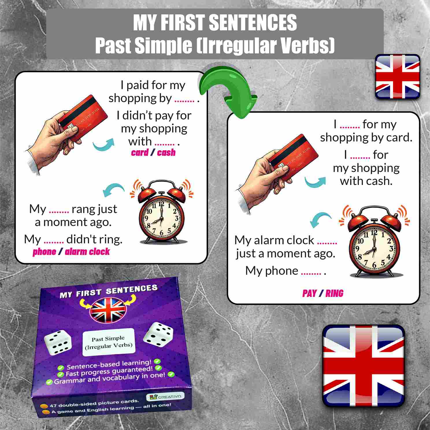 Each card connects a word with an image, helping learners remember new expressions faster and naturally reinforce grammar.